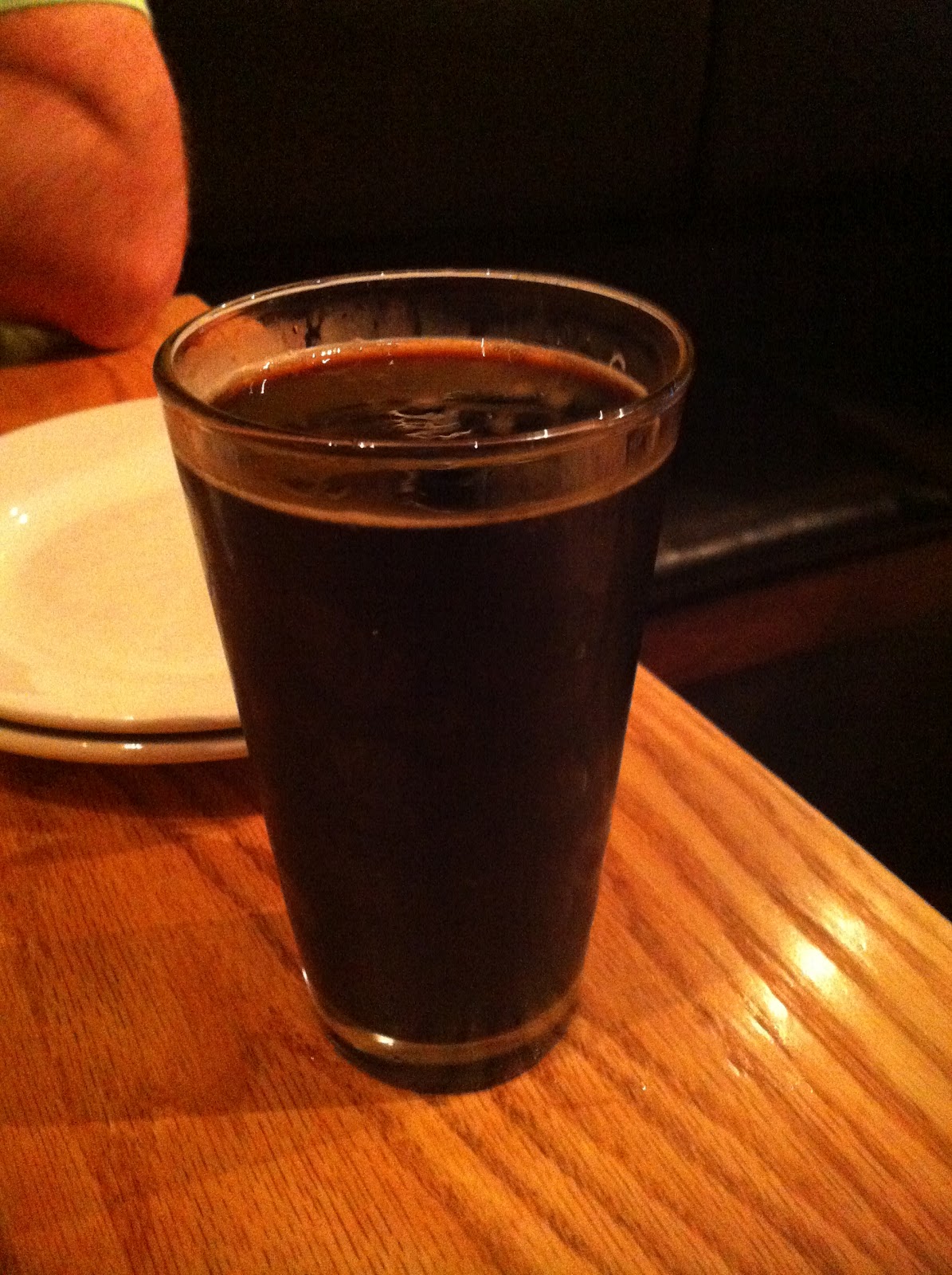Clockwise starting at top: chick pea and quinoa stuffed peppers from the Meat Lover's Meatless Cookbook, sauted brussel sprouts (without bacon grease--who knew?!?); fried green tomatoes and graniteed broccoli; Bridge Brew Works Moxxee Stout at Pies and Pints; and pizza with tomatoes, carmelized onions and mozzarella, and "The Mothership" tomato salad from Jamie At Home.